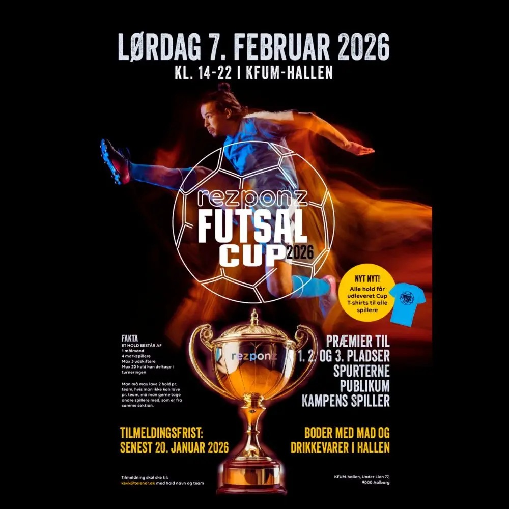 En dag med energi, fællesskab og futsal i topfart Lørdag d. 7. februar 2026 forvandles KFUM-Hallen i Aalborg til et samlingspunkt for både konkurrence, fællesskab og masser af god stemning, når vi afholder årets største sportsbegivenhed: Rezponz Futsal Cup 2026 – fra kl. 14.00 til 22.00. Turneringen er et tilbagevendende højdepunkt for alle, der er […]